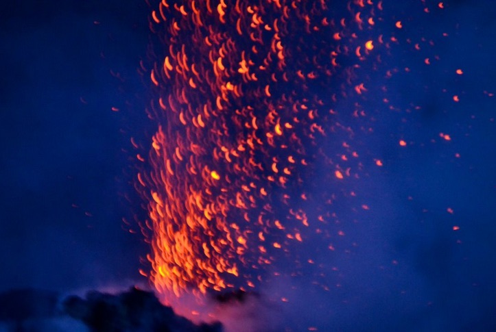 Après quelques heures de marche, on commence à entendre gronder le Stromboli. Le chemin est de plus en plus raide et inconfortable. Le soleil commence sa descente. Et tout d’un coup, sur l’arrête d’une montagne… on aperçoit une explosion rouge vif monter vers le ciel, accompagnée d’un craquement sourd. Puis l’explosion laisse place à un nuage gris que le vent éloigne lentement, quelques projectiles encore rouges dévalent la pente de cendres et disparaissent dans la mer.